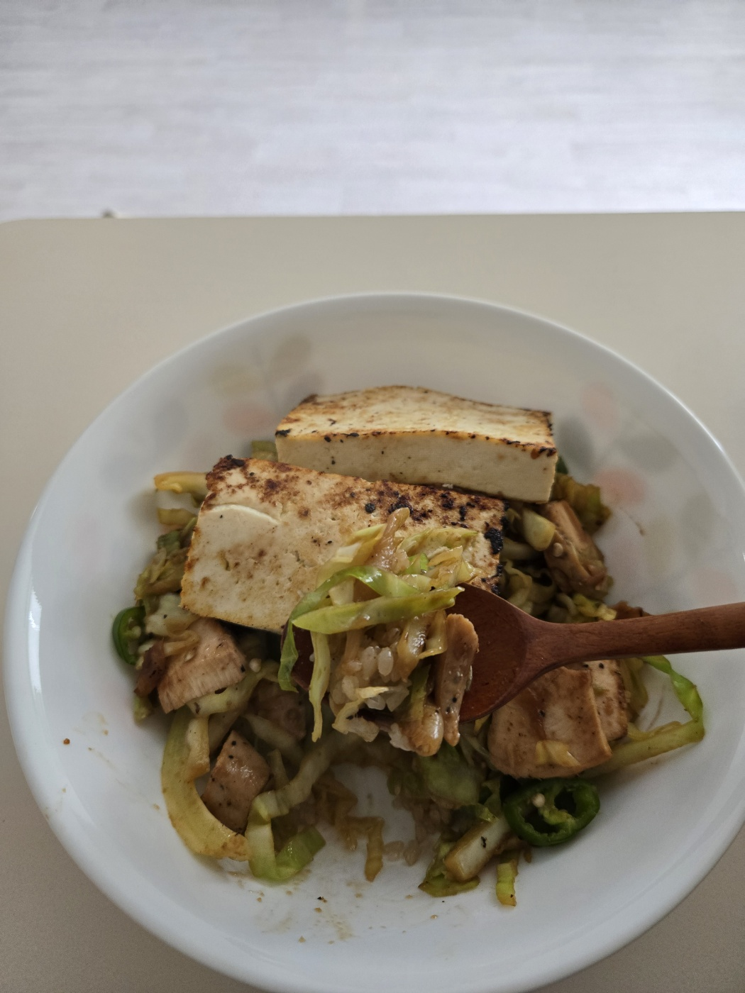 - 현미밥 위에 볶음을 올리고, 두부를 올립니다.