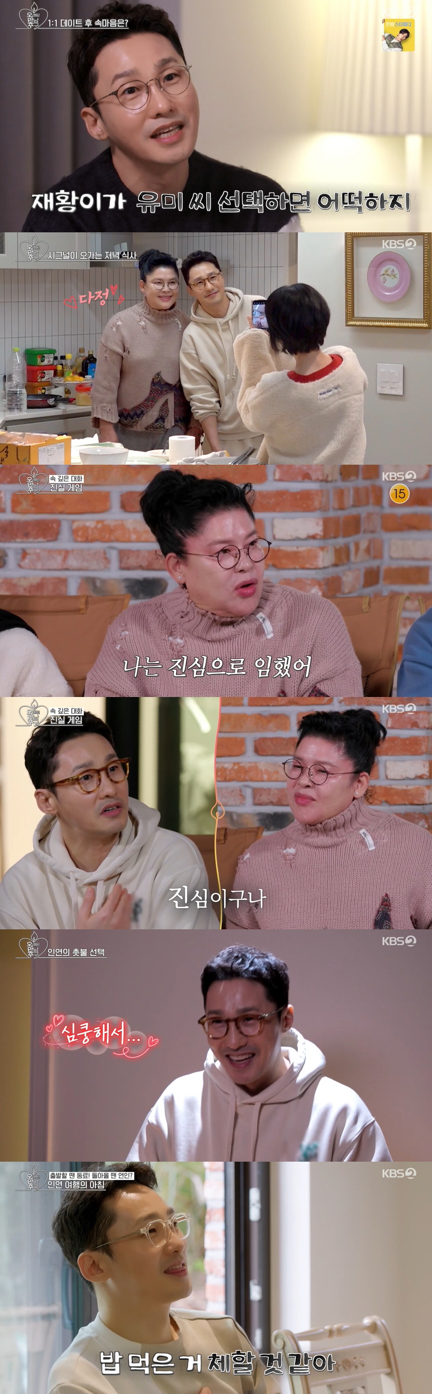 황동주는 직접 김치찜을 만들어 이영자에게 대접했습니다. 그는 "잘하진 않지만, 유미 씨를 위해 열심히 만들었다. 진짜 긴장됐다"며 떨리는 손으로 요리를 했습니다. 이를 지켜보던 이영자는 황동주의 땀을 조심스럽게 닦아주는 모습을 보였습니다. 또한 이어지는 바비큐 파티에서는 이영자는 “진심으로 임하고 있다”고 고백하며 진실게임의 막을 열었습니다. 마침내 운명의 촛불 선택이 진행됐고, 출연진들의 마음이 엇갈리는 가운데 이영자와 황동주는 서로를 선택하며 설렘을 증폭시켰습니다.